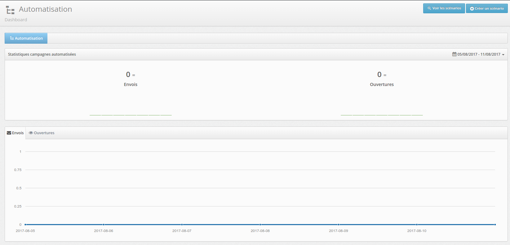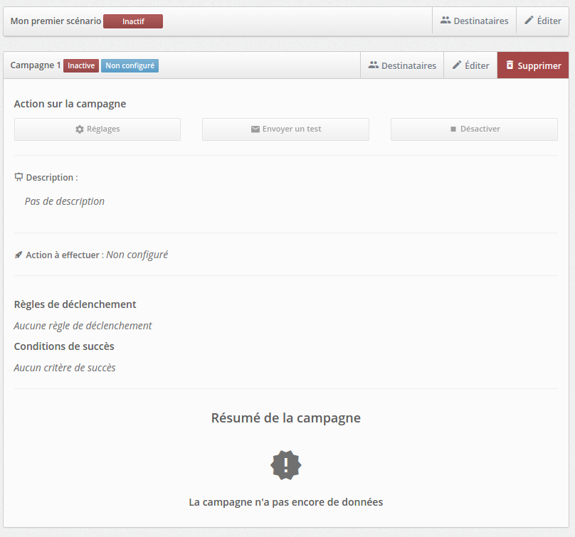 Lorsque vous cliquez sur un scénario ou l'une de ses campagnes vous obtenez alors le détail. Vous pouvez via cette partie, modifier ou supprimer l'élément (scénario et/ou campagne). |