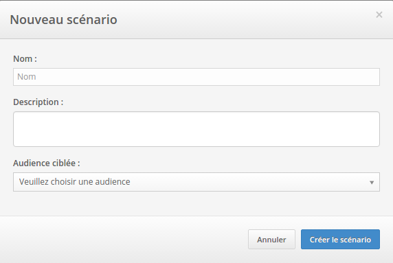 | Complétez: nom du scénario, description, et l'audience ciblée. Puis cliquez sur Créer le scénario |
