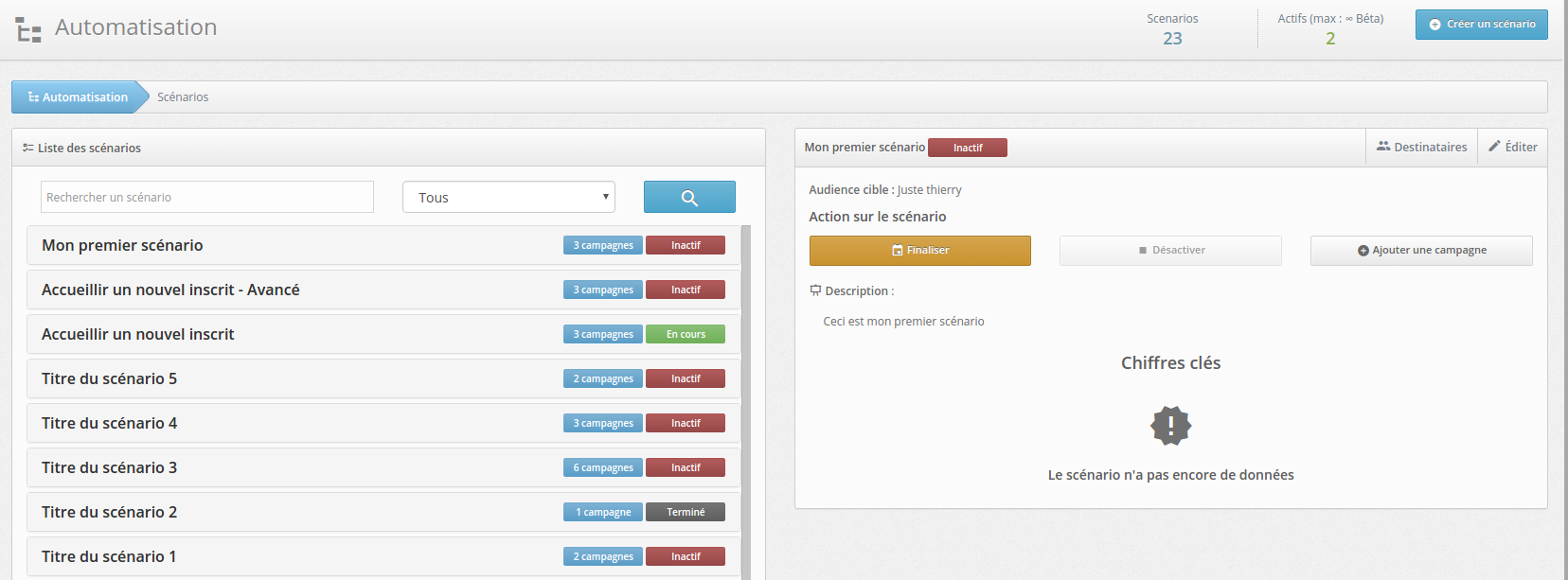 Après avoir cliqué sur le bouton Voir les scénarios, ou créé un scénario, vous obtiendrez le tableau de bord ci-contre. Vous pourrez alors voir sur la gauche la liste des scénarios et sur la droite le détail de l'élément sélectionné. |