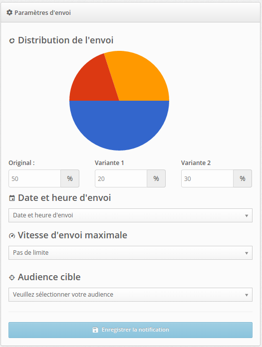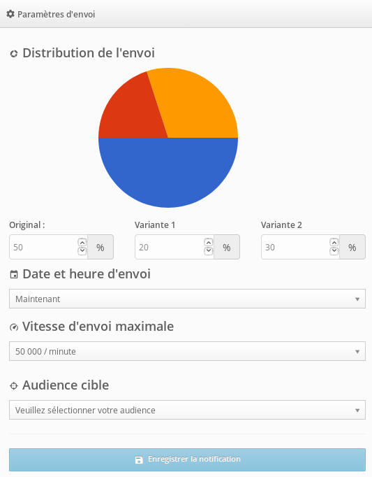 | Lors de la création de votre notifications desktop, le tableau de bord est composée de deux parties: la partie de gauche concerne l'outil de création et celle de droite (présentée ci-contre) permet de planifier votre campagne. Vous pouvez y choisir les différents paramètres de la campagne telles que l'audience destinataire et la planification de l'envoi. Dans le cas où vous ajoutez plusieurs variantes, vous pourrez choisir les proportions (en % avec un total de 100%) d'audience liées à chaque variante ainsi que la vitesse d'envoi (par minute) |