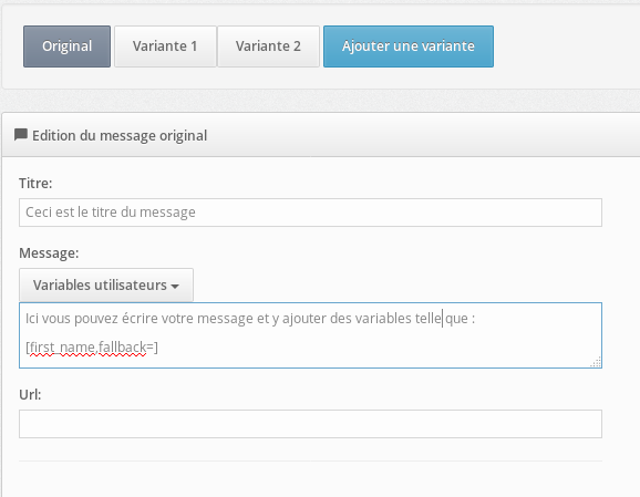 Sur la partie gauche vous pouvez gérer le contenu en y ajoutant le titre, l'URL vers lequel sera redirigé l'utilisateur en cliquant sur la notification, ainsi que le message . Vous pouvez ajouter des variables à ce message tel que le nom du destinataire, pour personnaliser vos notifications. Vous pouvez également, et là est l'intérêt de ce type de campagne, ajouter différentes versions de message grâce au bouton Ajouter une variante |