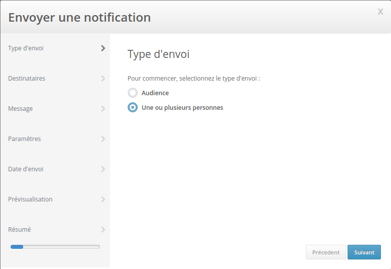 Sur la partie gauche vous pouvez gérer le contenu et en voir un aperçu. Vous pouvez ajouter des variables tel que le nom du destinataire pour personnaliser vos push. Vous pouvez également, et là est l'intérêt de ce type de campagne, ajouter différents messages grâce au bouton Ajouter une variante Sur la partie droite vous pouvez planifier l'envoi. |