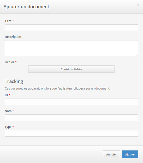 | Vous obtiendrez alors cette fenêtre. Vous devez remplir les champs, ceux marqués d'une astérisque rouge sont obligatoires. Tracking: ID: Permet d'attribuer à un document un identifiant. Nom: Nom du tracking Type: type du document importé. |